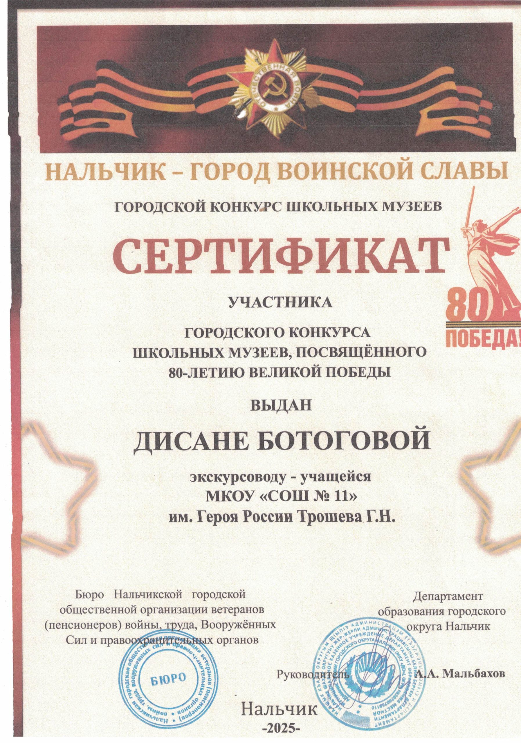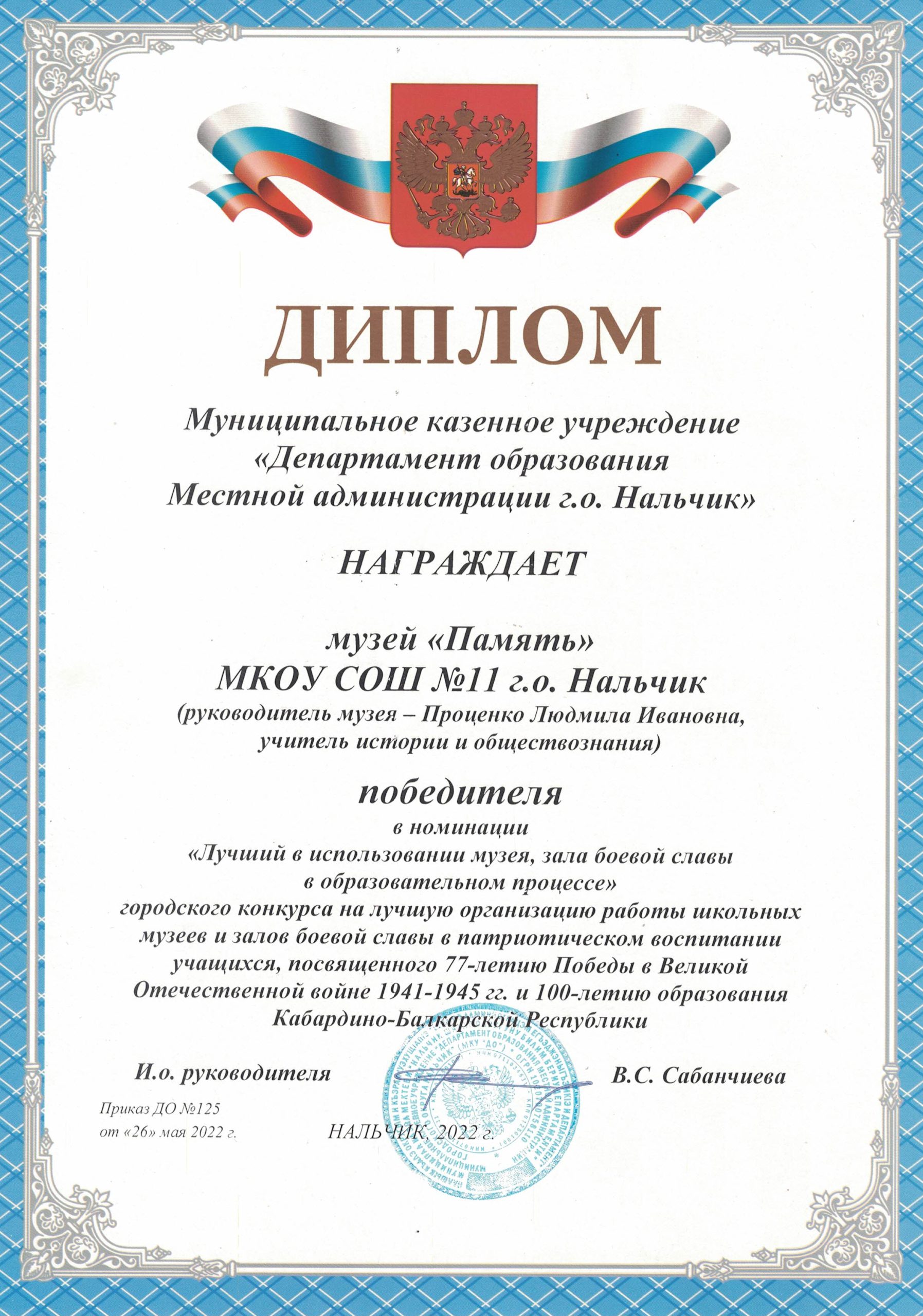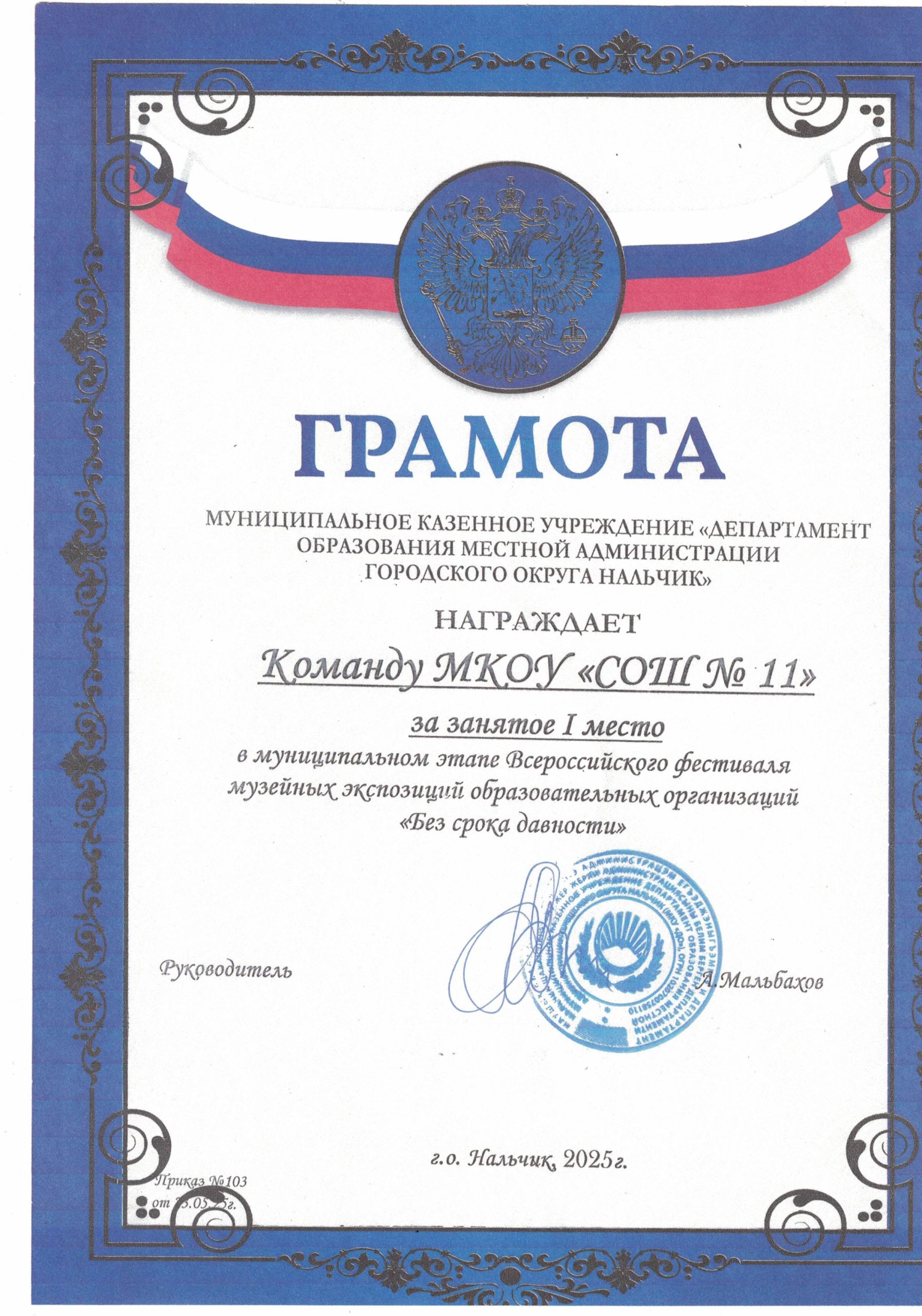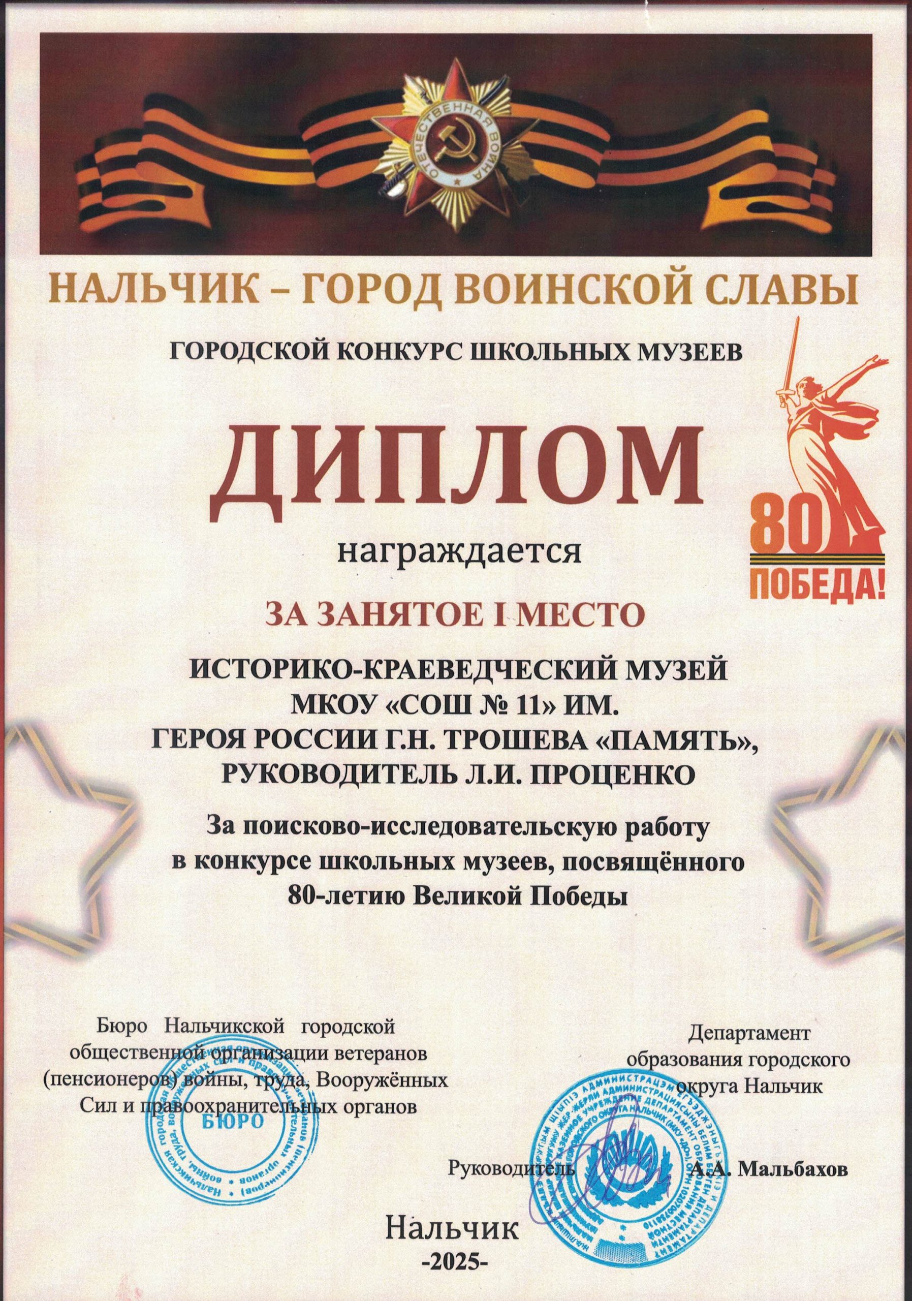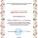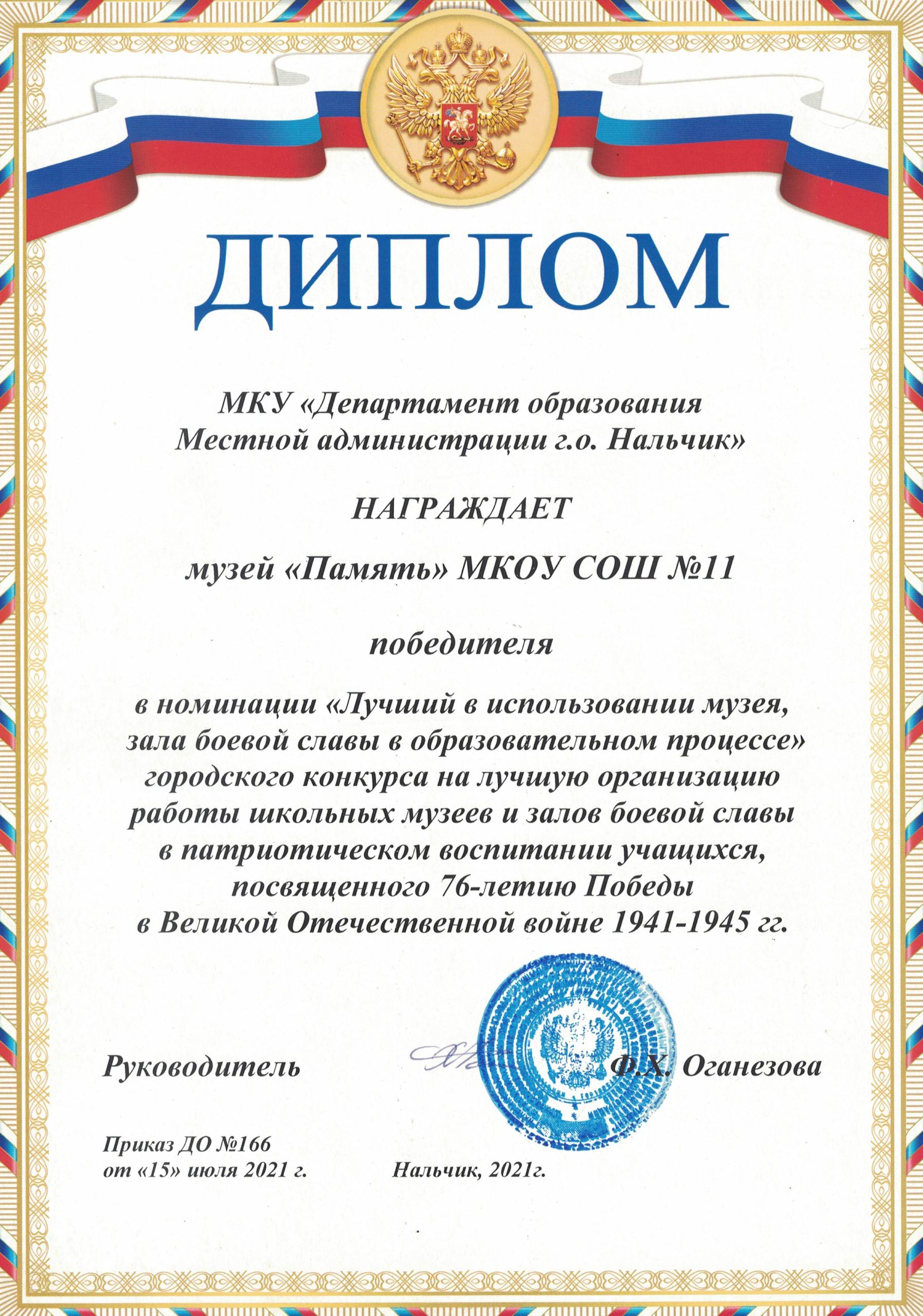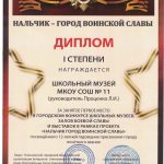 В 2017 году по итогам республиканского смотра музей «Память» МКОУ «СОШ№11» занял 1 место в республике среди школьных музеев.